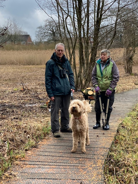 With the hailstones and sleet first thing we did wonder if anyone would join us this morning. But we should have known better - sixteen of us set to work removing the brash left after NWT’s tree removal work earlier in the week. Half of it was lovingly woven into a dead hedge behind the dump site off the central fen area.