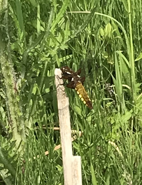 It’s been noticeable how few insects there seem to be about, but a male orange-tip butterfly was spotted, and it was especially nice to find this female broad-bodied chaser dragonfly.