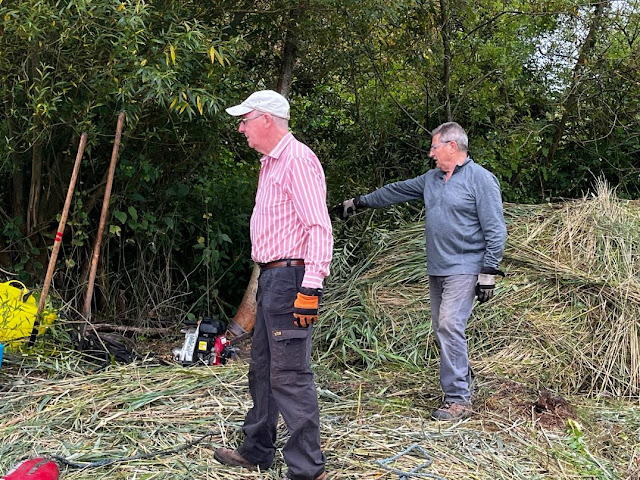 There was a good collection of hats on show, and many of us had decided that wellies were not required this time, the recent weather having been pretty dry. We were mainly concentrating on continuing to cut Area B, but were also under instruction to deal with the reeds making unwelcome inroads in Area A: here’s Kevin doing just that.